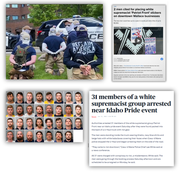 The Patriot Front is responsible for over 20 separate incidents involving distribution of propaganda in North Idaho so far in 2024, which is a significant increase over the last few years. Many of these instances involve multiple locations being targeted on the same day. The Patriot Front uses the publicity from their public displays to attract new members and they are responsible for thousands of racist, antisemitic, and other hateful acts of vandalism monthly nationwide.